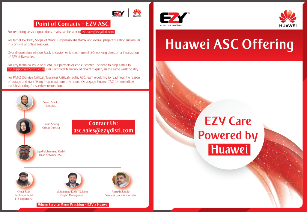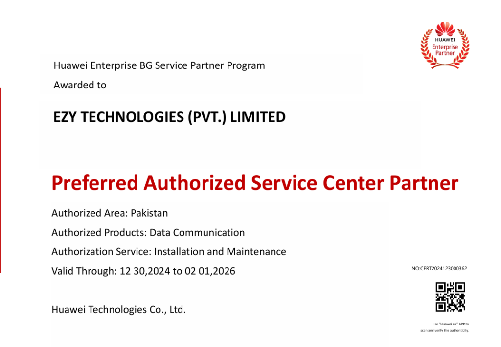 EZY ASC is dedicated to raising the bar of technical support and services for every Huawei partner and customer in Pakistan. Built on trust, technical excellence, and a commitment to fast and reliable service delivery, EZY is here to ensure business continuity and customer satisfaction.